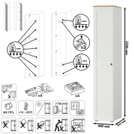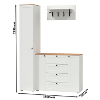 Комплектация состоит из пенала Остин 13.225, комода Остин 16.221 и вешалки Остин 15.12. Пенал имеет распашную дверь и внутри расположено шесть полок. Макс. нагрузка на каждую полку - 5 кг. Пенал имеет два варианта наполнения - 6 полок или штанга с антресольной и нижней полочками. 4 центральные полочки являются съемными и при необходимости, Вы оперативно можете переоборудовать пенал, установив штангу для одежды на плечиках. Универсальная сборка двери - может быть установлена как на левую, так и на правую сторону. Комод имеет три части - центральная - это 4 выдвижных ящика, по бокам расположены закрытые распашными дверками ниши с двумя полками в каждой. В комоде предусмотрены съемные полки. Навесная вешалка с 4 двухрожковыми крючками и полкой для головных уборов. Полка для головных уборов расположена над крючками и поддерживается двумя металлическими элементами. Макс. нагрузка на каждый крючек - 1,5 кг, на полку - 5 кг. Скрытые направляющие выдвижных ящиков. Двери оснащены 4хшарнирными петлями без доводчиков. Мебель оснащена регулируемыми опорами, выполненными из серого пластика. Лицевая фурнитура в виде черных аккуратных ручек. Изготовлена мебель из ЛДСП 16 мм, торцы окромлены ПХВ плёнкой. Фасады из рамочного профиля из МДФ со вставками ДВПО с узором. Поставляется в разобранном виде.