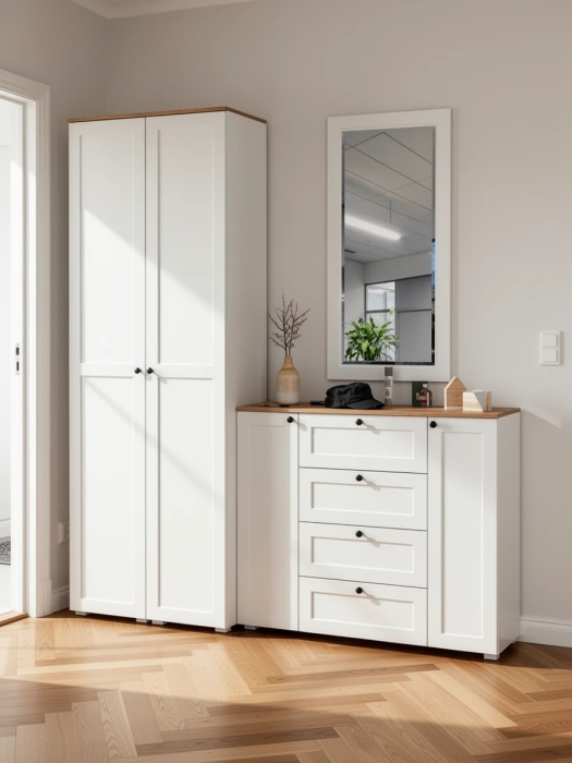 Два шкаф-пенала с полками для прихожей Остин и комод с настенным зеркалом.