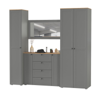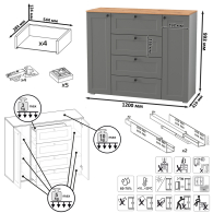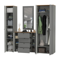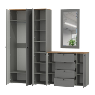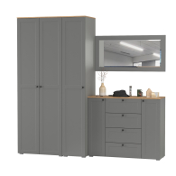 Комплектация состоит из пенала Остин 13.225, шкафа Остин 13.224, комода Остин 16.221 и зеркала Остин 17.03. Пенал имеет распашную дверь и внутри расположено шесть полок. Макс. нагрузка на каждую полку - 5 кг. Пенал имеет два варианта наполнения - 6 полок или штанга с антресольной и нижней полочками. 4 центральные полочки являются съемными и при необходимости, Вы оперативно можете переоборудовать пенал, установив штангу для одежды на плечиках. Универсальная сборка двери - может быть установлена как на левую, так и на правую сторону. Шкаф с двумя распашными дверьми предлагает удобное решение для хранения вашей одежды и аксессуаров. В его верхней части устроена антресольная полка. Под ней горизонтальная штанга для одежды на плечиках, снизу полка и ниша. Макс. нагрузка на каждую полку - 5 кг. Комод имеет три части - центральная - это 4 выдвижных ящика, по бокам расположены закрытые распашными дверками ниши с двумя полками в каждой. В комоде предусмотрены съемные полки. Навесное зеркало на панели из рамочного профиля МДФ. Зеркальное полотно имеет декоративный скос. Зеркало возможно повесить как горизонтально, так и вертикально. Скрытые крепежи зеркала. Скрытые направляющие выдвижных ящиков. Двери оснащены 4хшарнирными петлями без доводчиков. Мебель оснащена регулируемыми опорами из серого пластика. Лицевая фурнитура в виде черных аккуратных ручек. Изготовлена мебель из ЛДСП 16 мм, торцы окромлены ПХВ плёнкой. Фасады из рамочного профиля из МДФ со вставками ДВПО с узором. Поставляется в разобранном виде.