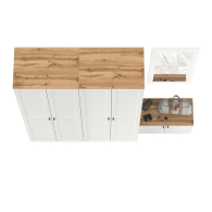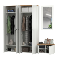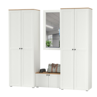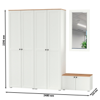 Комплектация состоит из двух шкафов Остин 13.224, тумбы Остин 13.257 и зеркала Остин 17.03. Два шкафа объединены интегрированы в единое блок, обеспечивая практичное решение для организации хранения. Каждый шкаф с двумя распашными дверьми предлагает удобное решение для хранения вашей одежды и аксессуаров. В его верхней части устроена антресольная полка. Под ней горизонтальная штанга для одежды на плечиках, снизу полка и ниша. Макс. нагрузка на каждую полку - 5 кг. За распашными дверками тумбы находятся два отделения, в каждом из которых имеются полки, расположенные по центру. В тумбе съемные полки для высокой обуви. Навесное зеркало на панели из рамочного профиля МДФ. Зеркальное полотно имеет декоративный скос. Зеркало возможно повесить как горизонтально, так и вертикально. Скрытые крепежи зеркала. Двери оснащены 4хшарнирными петлями без доводчиков. Мебель оснащена регулируемыми опорами из серого пластика. Лицевая фурнитура в виде черных аккуратных ручек. Изготовлена мебель из ЛДСП 16 мм, торцы окромлены ПХВ плёнкой. Фасады из рамочного профиля из МДФ со вставками ДВПО с узором. Поставляется в разобранном виде.