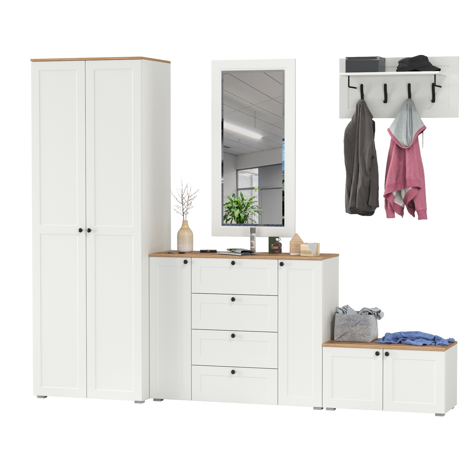 Комплектация состоит из шкафа Остин 13.224, комода Остин 16.221, тумбы Остин 13.257, вешалки Остин 15.12 и зеркала Остин 17.03. Шкаф с двумя распашными дверьми предлагает удобное решение для хранения вашей одежды и аксессуаров. В его верхней части устроена антресольная полка. Под ней горизонтальная штанга для одежды на плечиках, снизу полка и ниша. Макс. нагрузка на каждую полку - 5 кг. Комод имеет три части - центральная - это 4 выдвижных ящика, по бокам расположены закрытые распашными дверками ниши с двумя полками в каждой. В комоде предусмотрены съемные полки. За распашными дверками тумбы находятся два отделения, в каждом из которых имеются полки, расположенные по центру. В тумбе съемные полки для высокой обуви. Навесная вешалка с 4 двухрожковыми крючками и полкой для головных уборов. Полка для головных уборов над крючками и поддерживается 2 металл. элементами. Макс. нагрузка на каждый крючек - 1,5 кг, на полку - 5 кг. Навесное зеркало на панели из рамочного профиля МДФ. Зеркальное полотно имеет декоративный скос. Зеркало возможно повесить как горизонтально, так и вертикально. Скрытые крепежи зеркала. Скрытые направляющие выдвижных ящиков. Двери оснащены 4хшарнирными петлями без доводчиков. Мебель оснащена регулируемыми опорами из серого пластика. Лицевая фурнитура в виде черных аккуратных ручек. Изготовлена мебель из ЛДСП 16 мм, торцы окромлены ПХВ плёнкой. Фасады из рамочного профиля из МДФ со вставками ДВПО с узором. Поставляется в разобранном виде.