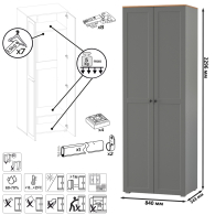 Комплектация состоит из пенала Остин 13.225, шкафа Остин 13.224, тумбы Остин 13.257, тумбы для обуви Остин 16.121, вешалки Остин 15.12 и зеркала Остин 17.03. Пенал имеет распашную дверь и внутри расположено шесть полок. Макс. нагрузка на каждую полку - 5 кг. Пенал имеет два варианта наполнения - 6 полок или штанга с антресольной и нижней полочками. 4 центральные полочки являются съемными и при необходимости, Вы оперативно можете переоборудовать пенал, установив штангу для одежды на плечиках. Универсальная сборка двери - может быть установлена как на левую, так и на правую сторону. Шкаф с двумя распашными дверьми предлагает удобное решение для хранения вашей одежды и аксессуаров. В его верхней части устроена антресольная полка. Под ней горизонтальная штанга для одежды на плечиках, снизу полка и ниша. Макс. нагрузка на каждую полку - 5 кг. За распашными дверками тумбы находятся два отделения, в каждом из которых имеются полки, расположенные по центру. В тумбе съемные полки для высокой обуви. Тумба с выдвижным ящиком и 2 откидными дверками с полками для 12 пар обуви снизу. Каждая откидная дверь расчитана для 6 пар невысокой обуви. Макс. нагрузка на каждую полку и ящик - 3 кг. Навесная вешалка с 4 двухрожковыми крючками и полкой для головных уборов. Полка для головных уборов над крючками и поддерживается 2 металл. элементами. Макс. нагрузка на каждый крючек - 1,5 кг, на полку - 5 кг. Навесное зеркало на панели из рамочного профиля МДФ. Зеркальное полотно имеет декоративный скос. Зеркало возможно повесить как горизонтально, так и вертикально. Скрытые крепежи зеркала. Скрытые направляющие выдвижных ящиков. Двери оснащены 4хшарнирными петлями без доводчиков. Мебель оснащена регулируемыми опорами из серого пластика. Лицевая фурнитура в виде черных аккуратных ручек. Изготовлена мебель из ЛДСП 16 мм, торцы окромлены ПХВ плёнкой. Фасады из рамочного профиля из МДФ со вставками ДВПО с узором. Поставляется в разобранном виде.