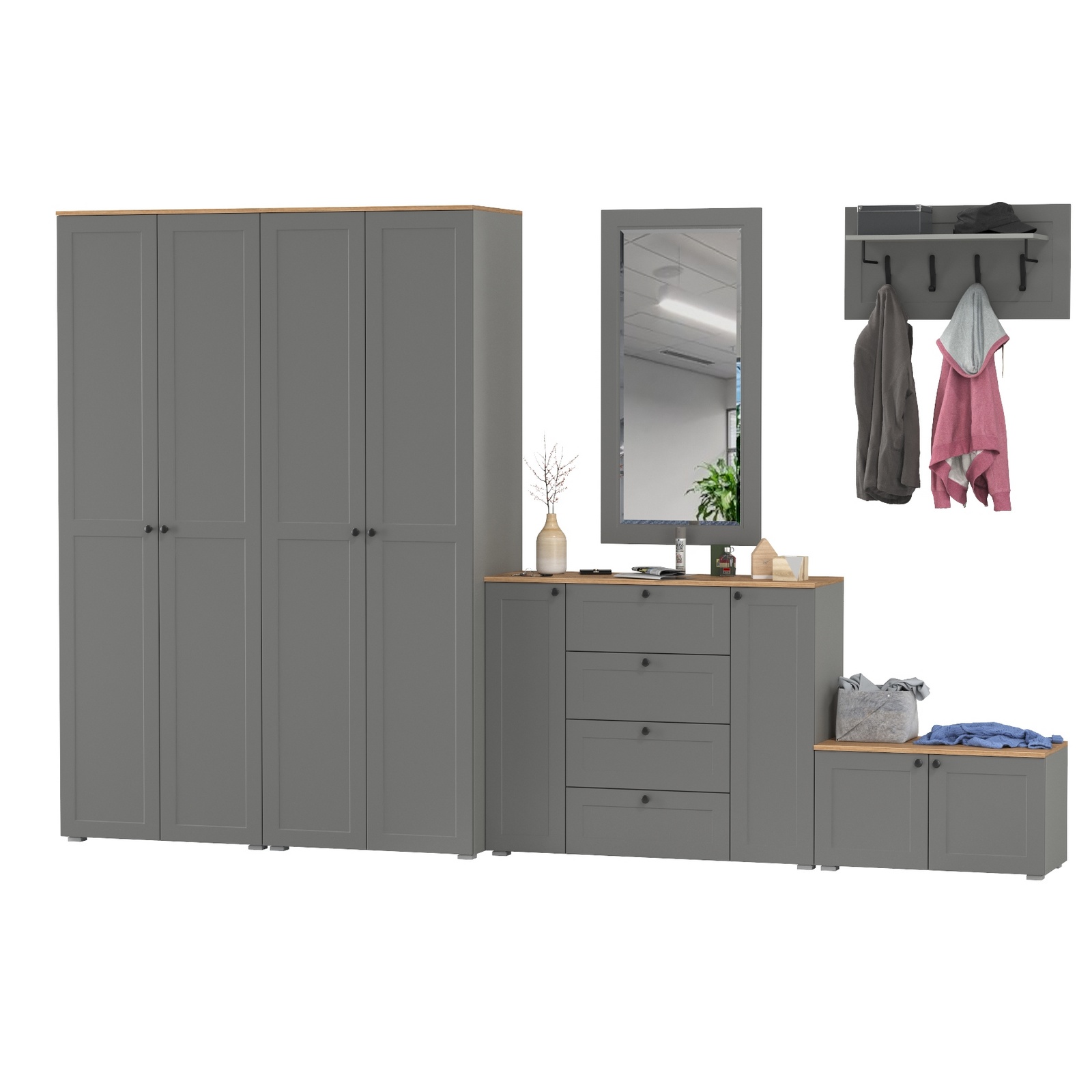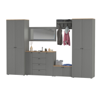 Комплектация состоит из двух шкафов Остин 13.224, комода Остин 16.221, тумбы Остин 13.257, вешалки Остин 15.12 и зеркала Остин 17.03. Два шкафа объединены интегрированы в единое блок, обеспечивая практичное решение для организации хранения. Каждый шкаф с двумя распашными дверьми предлагает удобное решение для хранения вашей одежды и аксессуаров. В его верхней части устроена антресольная полка. Под ней горизонтальная штанга для одежды на плечиках, снизу полка и ниша. Макс. нагрузка на каждую полку - 5 кг. Комод имеет три части - центральная - это 4 выдвижных ящика, по бокам расположены закрытые распашными дверками ниши с двумя полками в каждой. В комоде предусмотрены съемные полки. За распашными дверками тумбы находятся два отделения, в каждом из которых имеются полки, расположенные по центру. В тумбе съемные полки для высокой обуви. Навесная вешалка с 4 двухрожковыми крючками и полкой для головных уборов. Полка для головных уборов над крючками и поддерживается 2 металл. элементами. Макс. нагрузка на каждый крючек - 1,5 кг, на полку - 5 кг. Навесное зеркало на панели из рамочного профиля МДФ. Зеркальное полотно имеет декоративный скос. Зеркало возможно повесить как горизонтально, так и вертикально. Скрытые крепежи зеркала. Скрытые направляющие выдвижных ящиков. Двери оснащены 4хшарнирными петлями без доводчиков. Мебель оснащена регулируемыми опорами из серого пластика. Лицевая фурнитура в виде черных аккуратных ручек. Изготовлена мебель из ЛДСП 16 мм, торцы окромлены ПХВ плёнкой. Фасады из рамочного профиля из МДФ со вставками ДВПО с узором. Поставляется в разобранном виде.