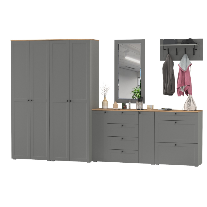 Комплектация состоит из двух шкафов Остин 13.224, комода Остин 16.221, тумбы для обуви Остин 16.121, вешалки Остин 15.12 и зеркала Остин 17.03.