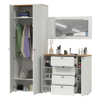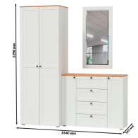 Комплектация состоит из шкафа Остин 13.224, комода Остин 16.221 и зеркала Остин 17.03. Шкаф с двумя распашными дверьми предлагает удобное решение для хранения вашей одежды и аксессуаров. В его верхней части устроена антресольная полка. Под ней горизонтальная штанга для одежды на плечиках, снизу полка и ниша. Макс. нагрузка на каждую полку - 5 кг. Комод имеет три части - центральная - это 4 выдвижных ящика, по бокам расположены закрытые распашными дверками ниши с двумя полками в каждой. В комоде предусмотрены съемные полки. Навесное зеркало на панели из рамочного профиля МДФ. Зеркальное полотно имеет декоративный скос. Зеркало возможно повесить как горизонтально, так и вертикально. Скрытые крепежи зеркала. Скрытые направляющие выдвижных ящиков. Двери оснащены 4хшарнирными петлями без доводчиков. Мебель оснащена регулируемыми опорами из серого пластика. Лицевая фурнитура в виде черных аккуратных ручек. Изготовлена мебель из ЛДСП 16 мм, торцы окромлены ПХВ плёнкой. Фасады из рамочного профиля из МДФ со вставками ДВПО с узором. Поставляется в разобранном виде.