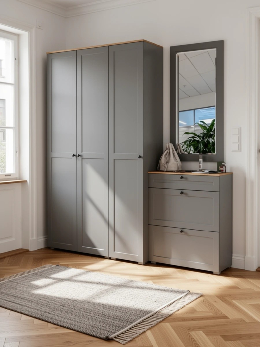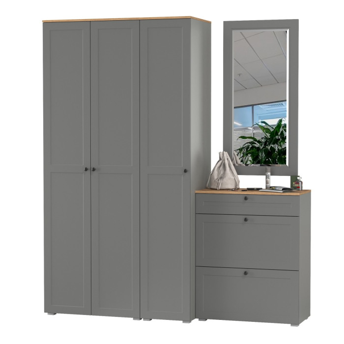 Комплектация состоит из пенала Остин 13.225, шкафа Остин 13.224, тумбы для обуви Остин 16.121 и зеркала Остин 17.03. Пенал имеет распашную дверь и внутри расположено шесть полок. Макс. нагрузка на каждую полку - 5 кг. Пенал имеет два варианта наполнения - 6 полок или штанга с антресольной и нижней полочками. 4 центральные полочки являются съемными и при необходимости, Вы оперативно можете переоборудовать пенал, установив штангу для одежды на плечиках. Универсальная сборка двери - может быть установлена как на левую, так и на правую сторону. Шкаф с двумя распашными дверьми предлагает удобное решение для хранения вашей одежды и аксессуаров. В его верхней части устроена антресольная полка. Под ней горизонтальная штанга для одежды на плечиках, снизу полка и ниша. Макс. нагрузка на каждую полку - 5 кг. Тумба с выдвижным ящиком и 2 откидными дверками с полками для 12 пар обуви снизу. Каждая откидная дверь расчитана для 6 пар невысокой обуви. Макс. нагрузка на каждую полку и ящик - 3 кг. Навесное зеркало на панели из рамочного профиля МДФ. Зеркальное полотно имеет декоративный скос. Зеркало возможно повесить как горизонтально, так и вертикально. Скрытые крепежи зеркала. Скрытые направляющие выдвижных ящиков. Двери оснащены 4хшарнирными петлями без доводчиков. Мебель оснащена регулируемыми опорами из серого пластика. Лицевая фурнитура в виде черных аккуратных ручек. Изготовлена мебель из ЛДСП 16 мм, торцы окромлены ПХВ плёнкой. Фасады из рамочного профиля из МДФ со вставками ДВПО с узором. Поставляется в разобранном виде.