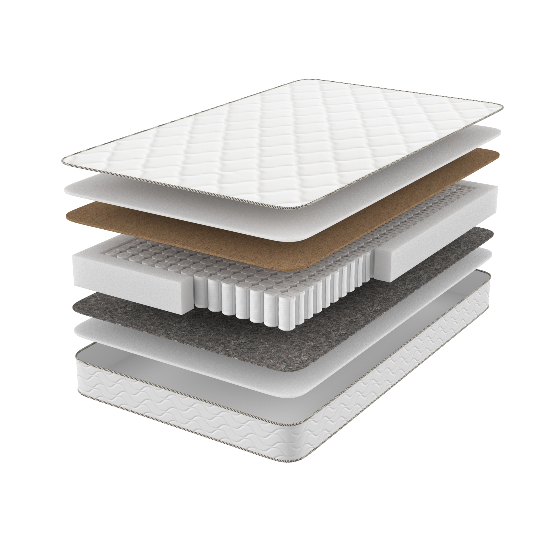 Матрас Optimal mini TFK на основе пружинного блока TFK. Для производства данной модели используются самые современные и качественные материалы. В основе лежит независимый пружинный блок ТФК (512 пружин на спальное место или 256 пружин на м2). Он обеспечивает сбалансированную точечную поддержку тела человека во время сна. Диаметр пружин около 6 см, высота 14 см. Толщина проволоки составляет 1,8 мм. Пружины отделены друг от друга и работают автономно. Каждая пружина помещена в тканевый чехол из спанбонда. Перфорация материала обеспечивает свободную вентиляцию воздуха внутри пружинного блока. Специфика независимого пружинного блока заключается в том, что в точках давления тела пружины могут продавливаться под нагрузкой без участия соседних пружин. Это обеспечивает полный повтор контуров тела при сне на спине, сохранение ровной линии позвоночника во время сна на боку, состояние комфорта на протяжении всей ночи. Ортопедический эффект модели усиливается благодаря наличию слоев ортопедической пены по обеим сторонам блока. Пена имеет пористую структуру, что обеспечивает прекрасную вентиляцию. Эластичный, упругий, долговечный материал, по своим потребительским свойствам максимально приближен к натуральному латексу, при этом является полностью гипоаллергенным. C одной стороны слой пены дополняет термовойлок - плотный материал, получаемый при горячем прессовании смеси шерстяных и синтетических волокон. Уровень жесткости - средний. С другой стороны слой ортопедической пены дополнительно усилен прослойкой кокосовой койры. Кокосовая койра, усиливающая ортопедический эффект матраса, является натуральным жестким наполнителем, полностью безопасным и гипоаллергенным. Уровень жесткости - выше средней. Состав матраса: 1. Ткань хлопковый жаккард, стеганный Холконом 400г/м2, спанбондом 40г/м2. 2. Термовойлок 500г/м2 (5мм) 3. Независимый пружинный блок ТФК Н=14см, 256пр/м2. Усиление периметра короб ППУ. 4. Кокосовая койра 5. ППУ 10 мм (с обеих сторон) Высота матраса: 18 см Нагрузка на спальное место - до 110 кг. Жесткость: Средняя/выше средней.