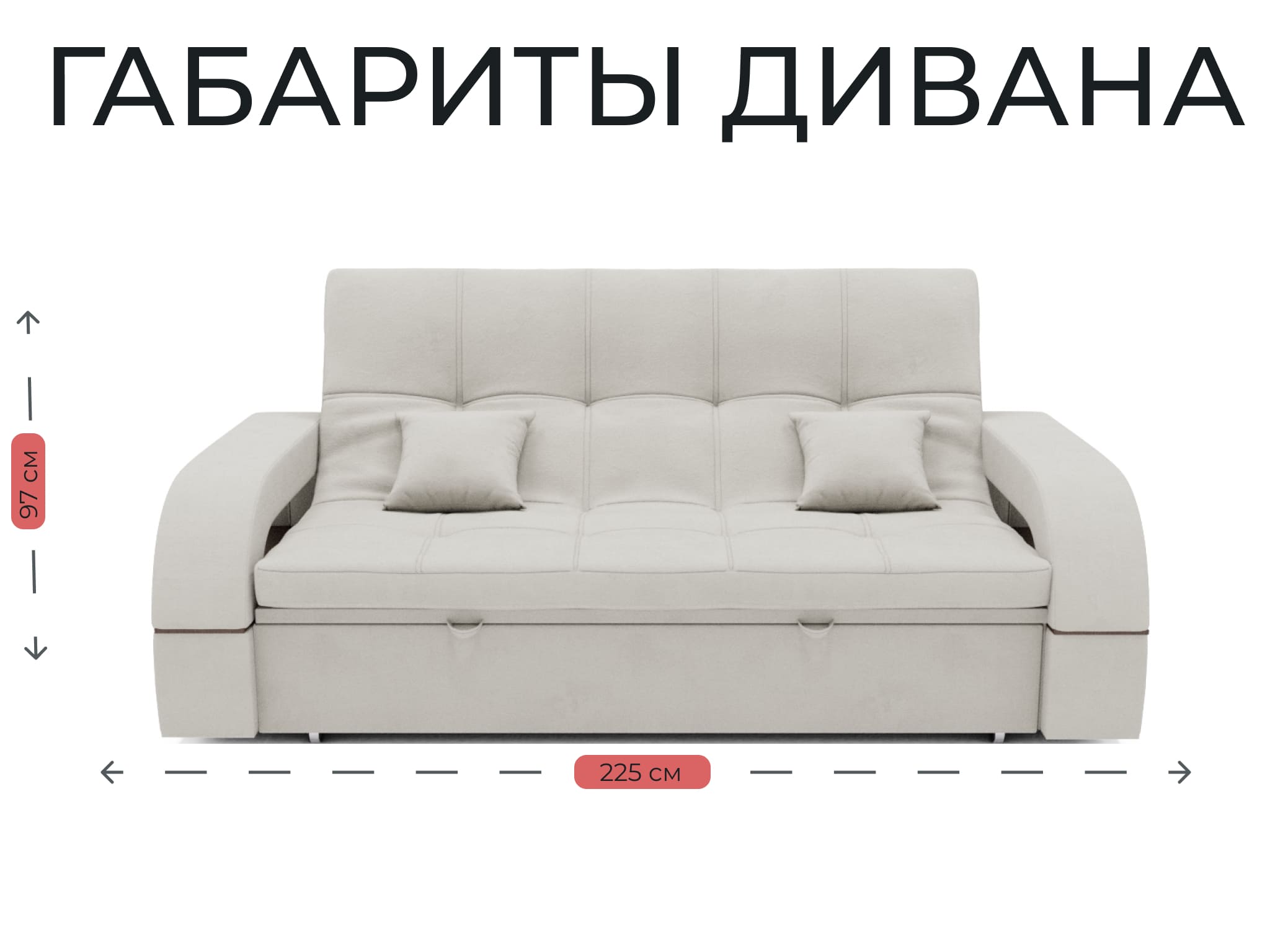 Он имеет высоту 97 см, ширину 225 см и глубину 102 см. Диван обладает универсальным расположением угла, что позволяет его использовать в любом помещении.