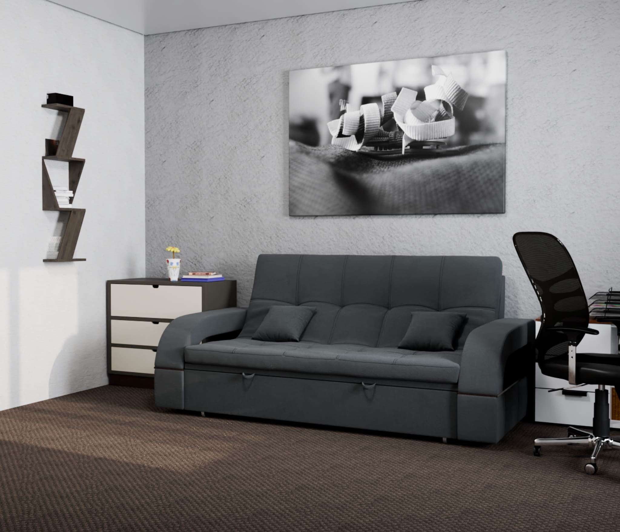Спальное место имеет ширину 135 см и длину 185 см. Он предназначен для двух человек и имеет глубину сиденья 65 см. Максимальная нагрузка на диван составляет 280 кг.