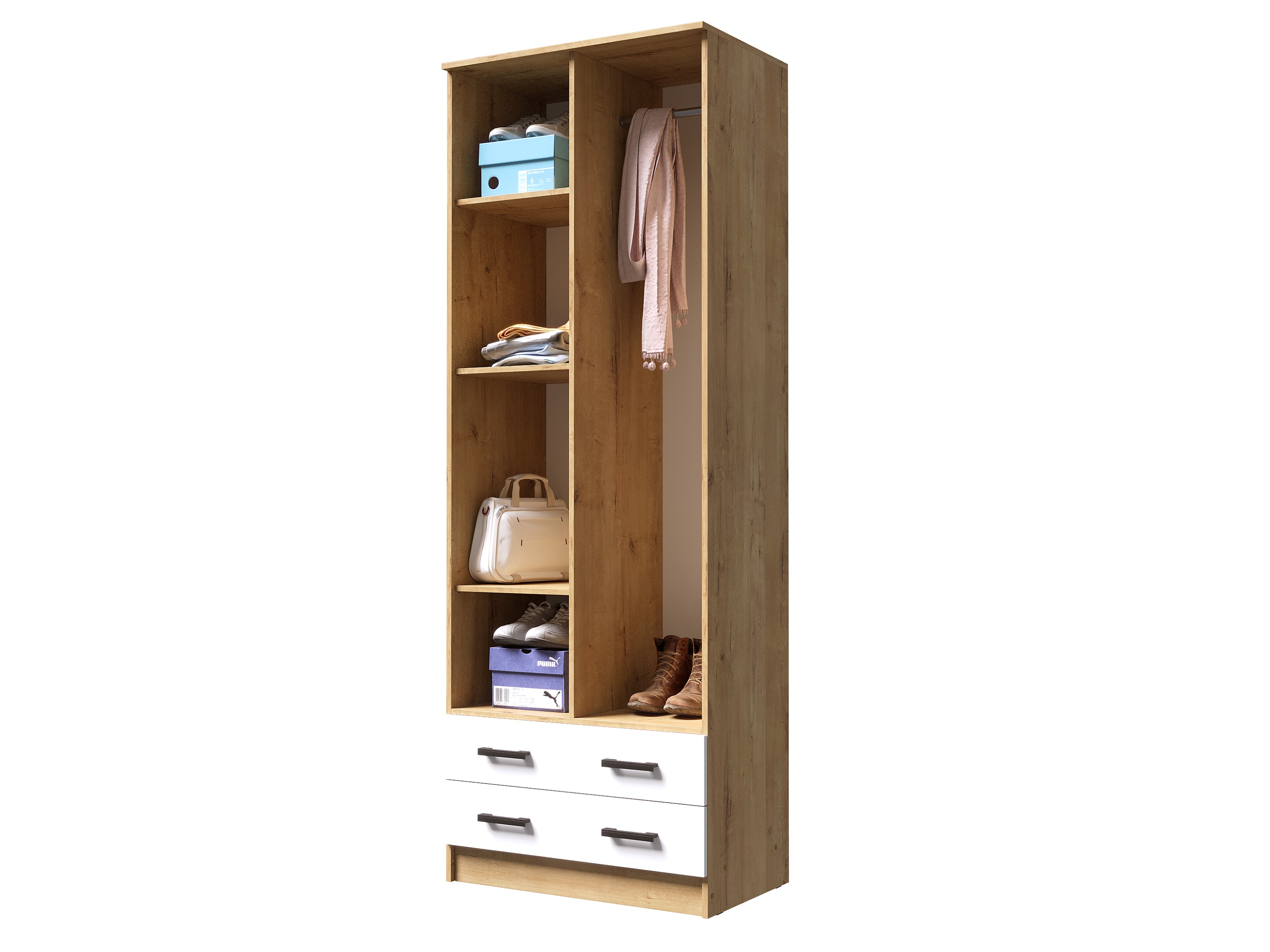 Эргономичное наполнение шкафа Дуэт: три полки, штанга, два выдвижных ящика, поможет удобно разместить ваши вещи в одном месте.